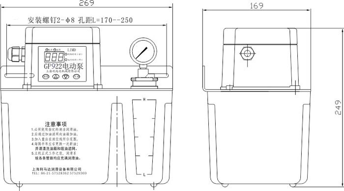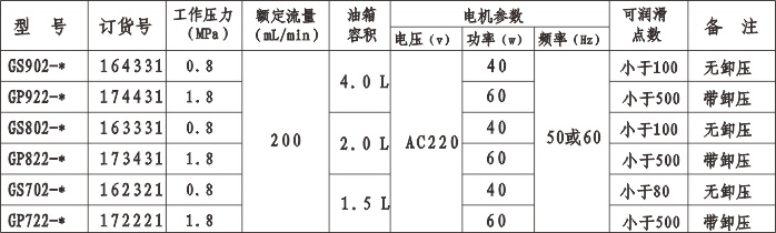 “GS902”系列自動(dòng)潤滑泵是一種電機(jī)驅(qū)動(dòng)齒輪泵。含“SK5”型電腦芯片控制器、液位開關(guān)、壓力開關(guān)、溢流閥等,屬間歇工作泵。用于需周期工作的抵抗式集中潤滑系統(tǒng)。油泵電機(jī)的運(yùn)行時(shí)間和間歇時(shí)間均采用數(shù)碼管顯示。 油泵外型尺寸:269X169X249. 工作電源:AC220v,50/60(Hz); 保險(xiǎn)絲規(guī)格:Φ5×20(2A); 額定壓力:0.8MPa; 適用潤滑介質(zhì):N32#~N68#潤滑油。