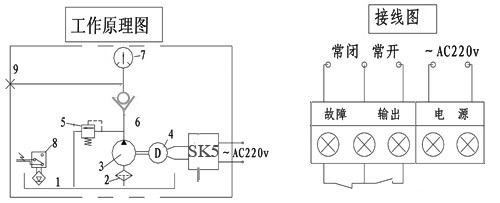工作原理 “GS”自動(dòng)泵工作原理:將間歇時(shí)間和運(yùn)行時(shí)間設(shè)定后,“SK5”型控制器控制電機(jī)4驅(qū)動(dòng)齒輪泵3運(yùn)轉(zhuǎn)。通過吸油濾網(wǎng)2從油箱1吸入潤滑油,經(jīng)單向閥6壓送至輸出口9輸往潤滑系統(tǒng)。工作時(shí)間到,油泵即進(jìn)入間歇等待狀態(tài),計(jì)滿間歇時(shí)間設(shè)定值,又進(jìn)入泵油狀態(tài)。周而復(fù)始,直至斷電,下次通電時(shí),系統(tǒng)記憶原工作參數(shù);油泵額定壓力由調(diào)壓閥5控制,壓力表7 顯示。液位開關(guān)8隨時(shí)檢測油位,當(dāng)油位低于下限位置時(shí),油泵也發(fā)出報(bào)警聲,輸出聯(lián)控信號(hào)等。數(shù)碼管顯示"LLL"。當(dāng)油位高過下限時(shí),油泵恢復(fù)正常工況,故障報(bào)警消失。
