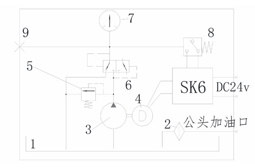 一、概述    "GP258"電動油脂泵,內含"SK6"型控制器、自動卸荷閥、自動排氣內閥、溢流閥、油脂過濾器、攪拌及壓送油脂的螺旋槳等,屬間歇工作泵。用于需周期工作的容積式定量集中潤滑系統(tǒng)。泵油間歇時間設置范圍:1~999分鐘(倒計時),具有斷電記憶功能;每次泵油時間長短根據環(huán)境溫度變化、負載多少自動調整;油泵的運行時間和間歇時間均采用數碼管顯示。       工作電源:DC24v; 功率:120(w);額定壓力:5.0(MPa);額定流量:120(ml/mim); 油箱容量:2升;適用介質:000#、00#、0#油脂。    二、工作原理    “GP258”電動油脂泵工作原理:將間歇時間設定后,即進入間歇倒計時狀態(tài),中途斷電再次通電后繼續(xù)遞減計時,累計計滿預設的間歇時間。"SK6"型控制器確認常開型壓力開關8復位的前提下(斷態(tài)信號,通態(tài)報警),控制電機4運轉驅動齒輪泵3泵油,經自動換向閥6壓送至輸出口9輸往潤滑系統(tǒng)。當系統(tǒng)分油結束,壓力上升到壓力開關動作壓力時,“SK6”型控制器指令油泵電機繼續(xù)運轉10秒鐘(這是保壓時間,可調)。期間系統(tǒng)壓力穩(wěn)定到溢流閥5的調定壓力(保壓)。停泵時,換向閥6在差壓信號的作用下恢復至左位機能,溝通主管路卸荷通道,系統(tǒng)壓力卸壓。額定壓力由調壓閥5控制,壓力表7顯示。  三、電氣接線說明     1、電源引線端接到DC24V電源,必須長供電,否則功能休止;     2、聯控輸出(常開常閉可選擇)接到主機控制端。不需要聯控主機工況的可讓其懸空。 四、使用與調整     1.參考“電氣接線說明”連接。只要接通電源,綠色“電源燈”常亮;當油泵電機處于運轉狀態(tài),綠色“運行燈”閃爍;當油泵電機處于停止狀態(tài),黃色“間歇燈”閃爍;當紅色“故障燈”閃爍且數碼管顯示 :“-E2”時表示卸壓故障(壓力開關沒有復位,處于通態(tài)信號),“-E3”時表示上次泵油時欠壓故障(低壓力報警,壓力開關沒有發(fā)出通態(tài)信號)。     2.油泵按鍵說明     2.1復位鍵,按此鍵完成一次完整的工作循環(huán)。完整的工作循環(huán)是:①檢測壓力開關是否復位,沒復位則報警顯示“-E2”,復位則進入第二階段;②啟動油泵泵油,從設定的最長泵油時間開始倒計時,期間如果一直沒有壓力開關的通態(tài)信號,則報警并顯示“-E3”,當系統(tǒng)壓力達到壓力開關動作值時,即進入第三階段;③保壓階段,保壓時間倒計時歸零,進入第四階段;④待機階段,計滿間歇時間開始下一循環(huán)。     2.2增加鍵,當進入相應設置狀態(tài)后,數碼管閃爍顯示對應的時間設定值,按此鍵對應的時間設定值將累加1。     2.3減少鍵,當進入相應設置狀態(tài)后,數碼管閃爍顯示對應的時間設定值,按此鍵對應的時間設定值將累減1。     2.4點動鍵,在工作狀態(tài)時,點按此鍵結束當前工作;在間隔狀態(tài)時,按此鍵則進入點動工作狀態(tài),數碼管累加顯示工作秒數。     3.工況設置(各類時間設置)     3.1 設置間歇時間:在間歇狀態(tài)下長按增加鍵5秒進入間隔時間調整狀態(tài),松開按鍵。再點按增加鍵或減少鍵來調整需要的間隔時間值,當目標值出現即松開按鍵,10秒后生效,可調整范圍為1-999分鐘。     3.2 設置最長泵油時間:在間隔狀態(tài)下同時按住增加鍵和減少鍵5秒,進入最長時間調整狀態(tài)界面,松開按鍵。再點按增加鍵或減少鍵來調整需要的最長泵油時間值,當目標值出現即松開按鍵,10秒后生效。     3.3 設置保壓時間:在間隔狀態(tài)下,先按住減少鍵不松開再同時按住點動鍵5秒,直到數碼管閃爍,松開按鍵。再點按增加鍵或減少鍵來調整需要的保壓時間值,當目標值出現即松開按鍵,10秒后生效,可調整范圍為0-60秒鐘。     4.注意事項     4.1 必須經過加油過濾器加入規(guī)定牌號的潤滑油,加入量應在油標規(guī)定的范圍內。     4.2 要注意電源線極性,如果正負極接反了,電源指示燈不亮,螺旋槳和泵芯反轉。螺旋槳和泵芯的轉向是一樣的,從油泵的上面往下看,順時針旋轉是正確的,逆時鐘旋轉是反轉。     4.3 壓力由溢流閥控制。順時針旋擰壓力閥調接螺釘,壓力升高;反之降低,出廠時均已調好5.0MPa。用戶一般不要隨意調節(jié)。