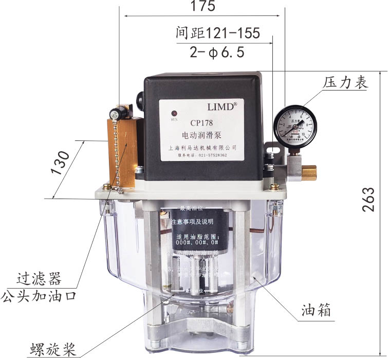 一、概述    CP178型電動(dòng)油脂泵是一種電機(jī)驅(qū)動(dòng)齒輪泵,屬于順置式結(jié)構(gòu):電機(jī)設(shè)在上方,油箱及泵芯設(shè)在下方。內(nèi)含自動(dòng)卸荷閥、調(diào)壓閥、攪拌及壓送油脂的螺旋槳等,屬間歇工作泵。用于需周期工作的容積式定量集中潤(rùn)滑系統(tǒng)。電動(dòng)泵的工況受外來(lái)指令控制,得電泵油,失電停泵及自動(dòng)卸壓。     電源電壓:DC24v,額定功率≤120w;額定壓力5.0MPa;額定流量120ml/min。油箱容積:1.5L;適用潤(rùn)滑介質(zhì):000#、00#、0#油脂。 二、工作原理   “CP178”電動(dòng)泵工作原理:電機(jī)采用雙動(dòng)力輸出,外圈低速旋轉(zhuǎn)驅(qū)動(dòng)螺旋槳及攪拌棒,用于攪拌及壓送油脂,解決油脂凝固及起助吸作用;內(nèi)圈高速旋轉(zhuǎn)驅(qū)動(dòng)泵芯泵油。     電機(jī)1得電,內(nèi)部高速動(dòng)力驅(qū)動(dòng)齒輪泵3運(yùn)轉(zhuǎn),從油箱1吸入油脂,泵出高壓油源。再經(jīng)自動(dòng)換向閥6壓送至輸出口8輸往系統(tǒng)。電機(jī)失電,停止泵油。自動(dòng)換向閥6在差壓信號(hào)的作用下恢復(fù)至左位機(jī)能,溝通主管路卸荷通道。系統(tǒng)壓力由調(diào)壓閥5控制,壓力表7顯示。 三、使用與調(diào)整     1.潤(rùn)滑泵適用環(huán)境溫度:-5°C~ 65°C;潤(rùn)滑介質(zhì):000#、00#、0#油脂。     2.向油泵添加潤(rùn)滑油脂,可用采用快插母頭插入“油脂過(guò)濾器上的公頭進(jìn)油口”,加入量應(yīng)在油箱的油位線(xiàn)范圍內(nèi)。向油泵加油結(jié)束后請(qǐng)及時(shí)蓋上公頭加油口的橡膠蓋帽。當(dāng)感覺(jué)加油阻力增大,透明油箱內(nèi)油脂過(guò)濾器流出的油量變少時(shí),就應(yīng)拆下油脂過(guò)濾芯清洗。     3.油泵應(yīng)水平安裝,應(yīng)盡量避免在有腐蝕性氣體、塵埃和高濕環(huán)境下使用。     4.接線(xiàn)時(shí),打開(kāi)上罩蓋,按接線(xiàn)圖所示,黑色1、2接入DC24V電源,3接地,接線(xiàn)時(shí)應(yīng)注意電源的正負(fù)極性,不能接反。正常轉(zhuǎn)向是從油泵上面往下看螺旋槳順時(shí)針旋轉(zhuǎn);如果正負(fù)極接反,則電源指示燈不亮,螺旋槳逆時(shí)鐘旋轉(zhuǎn)。接通電源后,不允許打開(kāi)罩蓋,以防發(fā)生電擊危險(xiǎn)。     5.油泵得電,電源指示燈亮,油泵供送壓力油源;油泵失電則電源指示燈滅、停止泵油并且自動(dòng)卸壓。潤(rùn)滑工況由主機(jī)電控箱控制。     6.油泵工作壓力由調(diào)壓閥控制,調(diào)壓閥設(shè)在中框左后側(cè),調(diào)壓方便。調(diào)壓時(shí)請(qǐng)松開(kāi)并帽,順時(shí)針旋擰調(diào)壓螺釘壓力升高,反之壓力下降。調(diào)壓結(jié)束后請(qǐng)鎖緊并帽。出廠(chǎng)時(shí)均已調(diào)好(5.0 MPa)且鎖緊。用戶(hù)一般不要隨意調(diào)節(jié)。                            |