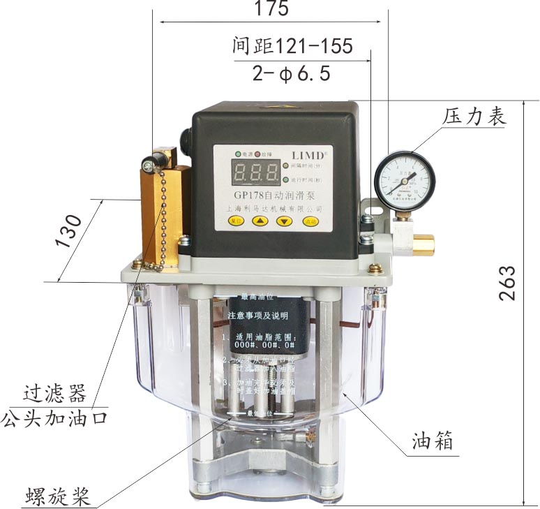 一、概述    "GP178"電動油脂泵,內(nèi)含"SK6"型控制器、自動卸荷閥、自動排氣內(nèi)閥、溢流閥、油脂過濾器、攪拌及壓送油脂的螺旋槳等,屬間歇工作泵。用于需周期工作的容積式定量集中潤滑系統(tǒng)。泵油間歇時間設(shè)置范圍:1~999分鐘(倒計時),具有斷電記憶功能;每次泵油時間長短根據(jù)環(huán)境溫度變化、負載多少自動調(diào)整;油泵的運行時間和間歇時間均采用數(shù)碼管顯示。       工作電源:DC24v; 功率:120(w);額定壓力:5.0(MPa);額定流量:120(ml/mim); 油箱容量:1.5升;適用介質(zhì):000#、00#、0#油脂。    二、工作原理    “GP178”電動油脂泵工作原理:將間歇時間設(shè)定后,即進入間歇倒計時狀態(tài),中途斷電再次通電后繼續(xù)遞減計時,累計計滿預(yù)設(shè)的間歇時間。"SK6"型控制器確認常開型壓力開關(guān)8復(fù)位的前提下(斷態(tài)信號,通態(tài)報警),控制電機4運轉(zhuǎn)驅(qū)動齒輪泵3泵油,經(jīng)自動換向閥6壓送至輸出口9輸往潤滑系統(tǒng)。當(dāng)系統(tǒng)分油結(jié)束,壓力上升到壓力開關(guān)動作壓力時,“SK6”型控制器指令油泵電機繼續(xù)運轉(zhuǎn)10秒鐘(這是保壓時間,可調(diào))。期間系統(tǒng)壓力穩(wěn)定到溢流閥5的調(diào)定壓力(保壓)。停泵時,換向閥6在差壓信號的作用下恢復(fù)至左位機能,溝通主管路卸荷通道,系統(tǒng)壓力卸壓。額定壓力由調(diào)壓閥5控制,壓力表7顯示。  三、電氣接線說明     1、電源引線端接到DC24V電源,必須長供電,否則功能休止;     2、聯(lián)控輸出(常開常閉可選擇)接到主機控制端。不需要聯(lián)控主機工況的可讓其懸空。 四、使用與調(diào)整     1.參考“電氣接線說明”連接。只要接通電源,綠色“電源燈”常亮;當(dāng)油泵電機處于運轉(zhuǎn)狀態(tài),綠色“運行燈”閃爍;當(dāng)油泵電機處于停止?fàn)顟B(tài),黃色“間歇燈”閃爍;當(dāng)紅色“故障燈”閃爍且數(shù)碼管顯示 :“-E2”時表示卸壓故障(壓力開關(guān)沒有復(fù)位,處于通態(tài)信號),“-E3”時表示上次泵油時欠壓故障(低壓力報警,壓力開關(guān)沒有發(fā)出通態(tài)信號)。     2.油泵按鍵說明     2.1復(fù)位鍵,按此鍵完成一次完整的工作循環(huán)。完整的工作循環(huán)是:①檢測壓力開關(guān)是否復(fù)位,沒復(fù)位則報警顯示“-E2”,復(fù)位則進入第二階段;②啟動油泵泵油,從設(shè)定的最長泵油時間開始倒計時,期間如果一直沒有壓力開關(guān)的通態(tài)信號,則報警并顯示“-E3”,當(dāng)系統(tǒng)壓力達到壓力開關(guān)動作值時,即進入第三階段;③保壓階段,保壓時間倒計時歸零,進入第四階段;④待機階段,計滿間歇時間開始下一循環(huán)。     2.2增加鍵,當(dāng)進入相應(yīng)設(shè)置狀態(tài)后,數(shù)碼管閃爍顯示對應(yīng)的時間設(shè)定值,按此鍵對應(yīng)的時間設(shè)定值將累加1。     2.3減少鍵,當(dāng)進入相應(yīng)設(shè)置狀態(tài)后,數(shù)碼管閃爍顯示對應(yīng)的時間設(shè)定值,按此鍵對應(yīng)的時間設(shè)定值將累減1。     2.4點動鍵,在工作狀態(tài)時,點按此鍵結(jié)束當(dāng)前工作;在間隔狀態(tài)時,按此鍵則進入點動工作狀態(tài),數(shù)碼管累加顯示工作秒數(shù)。     3.工況設(shè)置(各類時間設(shè)置)     3.1 設(shè)置間歇時間:在間歇狀態(tài)下長按增加鍵5秒進入間隔時間調(diào)整狀態(tài),松開按鍵。再點按增加鍵或減少鍵來調(diào)整需要的間隔時間值,當(dāng)目標(biāo)值出現(xiàn)即松開按鍵,10秒后生效,可調(diào)整范圍為1-999分鐘。     3.2 設(shè)置最長泵油時間:在間隔狀態(tài)下同時按住增加鍵和減少鍵5秒,進入最長時間調(diào)整狀態(tài)界面,松開按鍵。再點按增加鍵或減少鍵來調(diào)整需要的最長泵油時間值,當(dāng)目標(biāo)值出現(xiàn)即松開按鍵,10秒后生效。     3.3 設(shè)置保壓時間:在間隔狀態(tài)下,先按住減少鍵不松開再同時按住點動鍵5秒,直到數(shù)碼管閃爍,松開按鍵。再點按增加鍵或減少鍵來調(diào)整需要的保壓時間值,當(dāng)目標(biāo)值出現(xiàn)即松開按鍵,10秒后生效,可調(diào)整范圍為0-60秒鐘。     4.注意事項     4.1 必須經(jīng)過加油過濾器加入規(guī)定牌號的潤滑油,加入量應(yīng)在油標(biāo)規(guī)定的范圍內(nèi)。     4.2 要注意電源線極性,如果正負極接反了,電源指示燈不亮,螺旋槳和泵芯反轉(zhuǎn)。螺旋槳和泵芯的轉(zhuǎn)向是一樣的,從油泵的上面往下看,順時針旋轉(zhuǎn)是正確的,逆時鐘旋轉(zhuǎn)是反轉(zhuǎn)。     4.3 壓力由溢流閥控制。順時針旋擰壓力閥調(diào)接螺釘,壓力升高;反之降低,出廠時均已調(diào)好5.0MPa。用戶一般不要隨意調(diào)節(jié)。